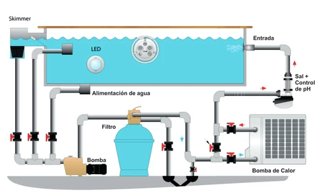 El funcionamiento de la bomba de calor consiste en que el agua luego de ser filtrada en lugar de retornar a la piscina directamente primero va a pasar por la bomba donde se va climatizar, y recién ahí va a retornar a la piscina. Toda la operatoria es automática y el usuario no debe realizar nada.
