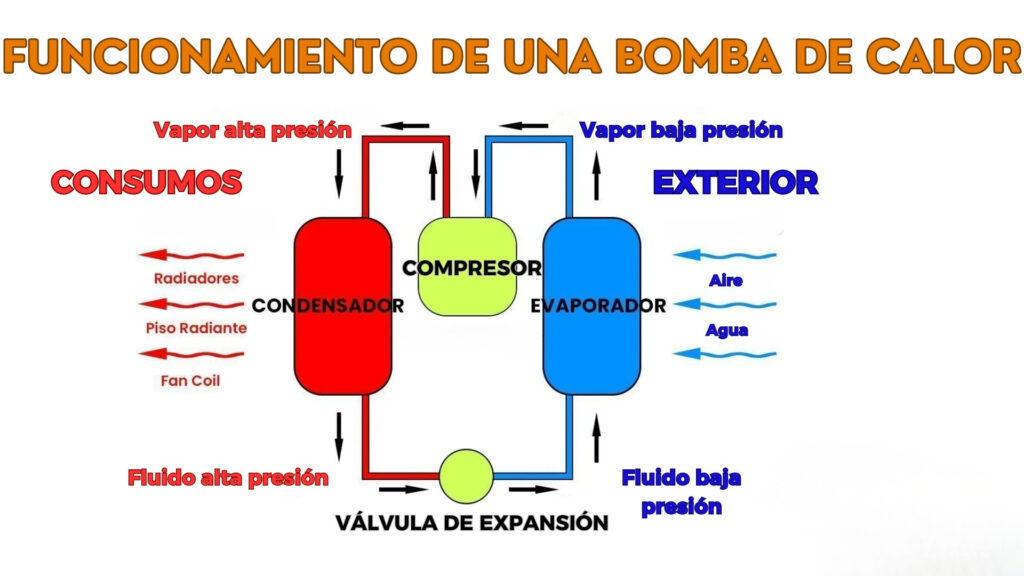 Básicamente la bomba de calor toma aire del exterior, el refrigerante que contiene el EVAPORADOR absorbe el calor del mismo calentado el gas interno, al pasar luego por el COMPRESOR el gas aumenta mucho su temperatura por el aumento de la presión del mismo, sigue hacia el CONDENSADOR donde se produce el intercambio del calor pasando el calor del gas al agua la cual va hacia los consumos. El gas con menor temperatura pero aún con alta presión se dirige a la VÁLVULA DE EXPANSIÓN que hace descender la presión del gas y luego vuelve al EVAPORADOR para volver a comenzar el ciclo.
