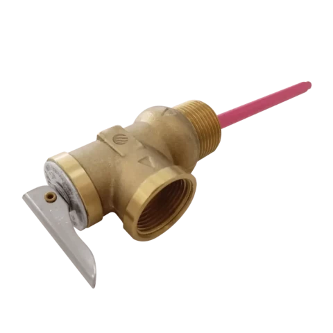 Válvula que se coloca en la parte superior del termotanque, en el caso que la temperatura interna del tanque sea muy elevada (más de 90°) por la válvula podría salir desde vapor hasta agua hirviendo por eso le instalamos a su salida de 1/2″ una cañería hacía algún lugar de desagote.